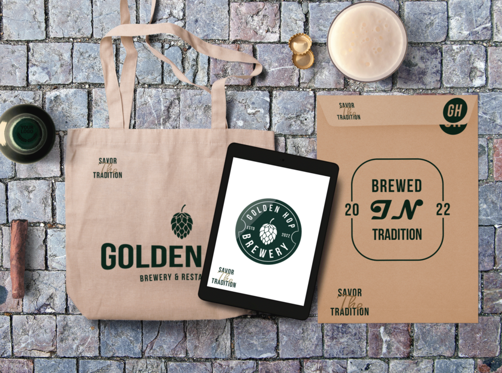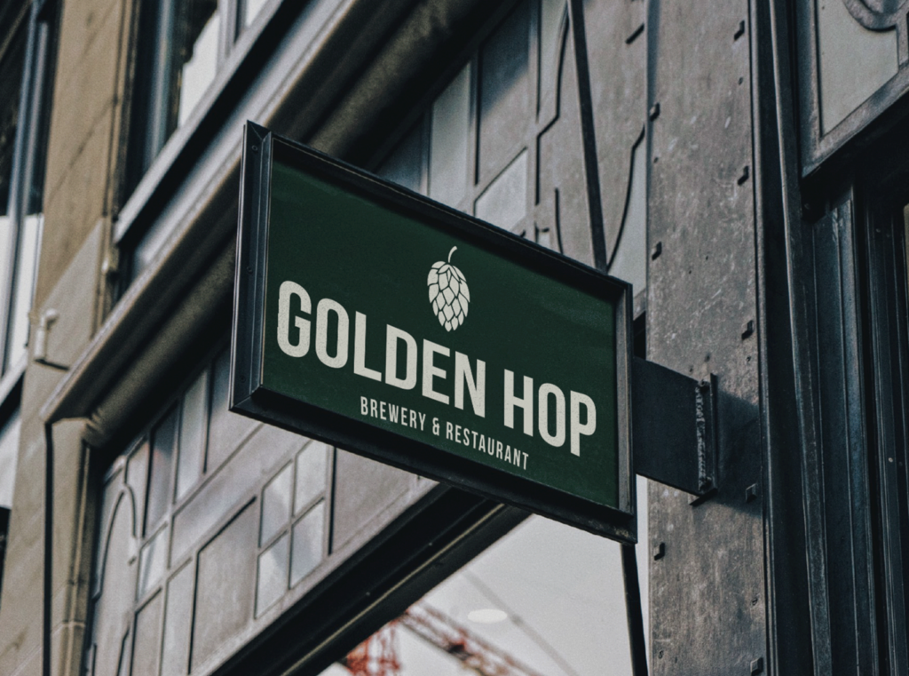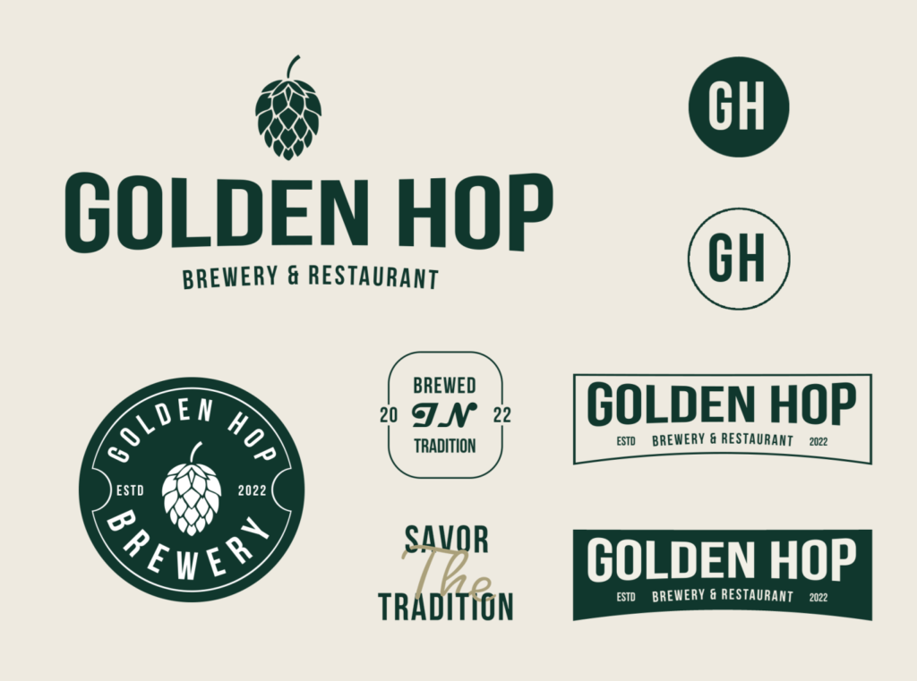The color palette for Golden Hop features a deep forest green, muted beige, and soft off-white. The deep green exudes tradition and quality, representing the natural elements of brewing. Beige adds warmth and sophistication, complementing the green, while off-white maintains a clean, elegant look, ensuring text and logos stand out.